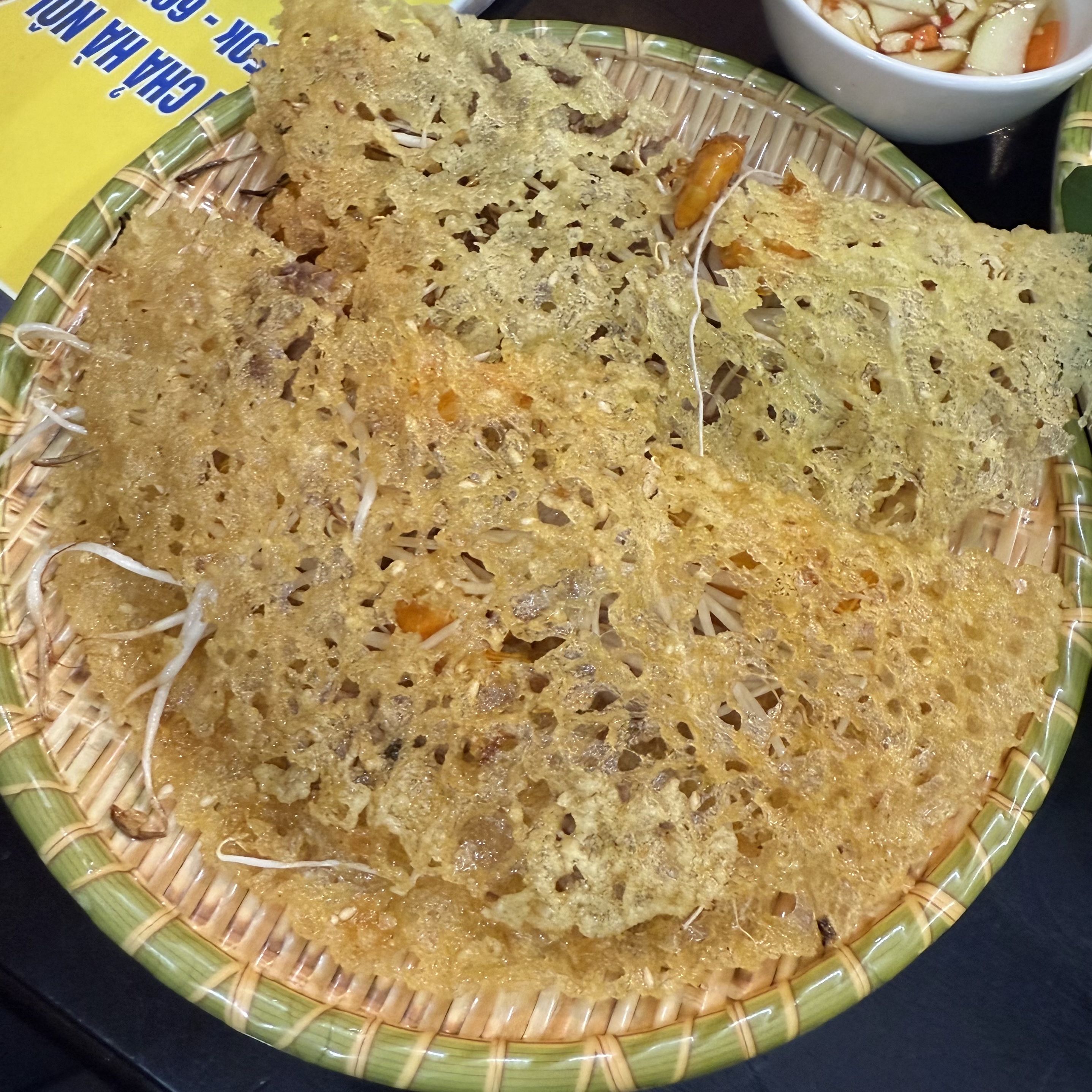 바삭한 크레페처럼 생긴 반쎄오도 함께 주문했는데, 안에는 숙주, 고기, 새우가 들어 있었다.