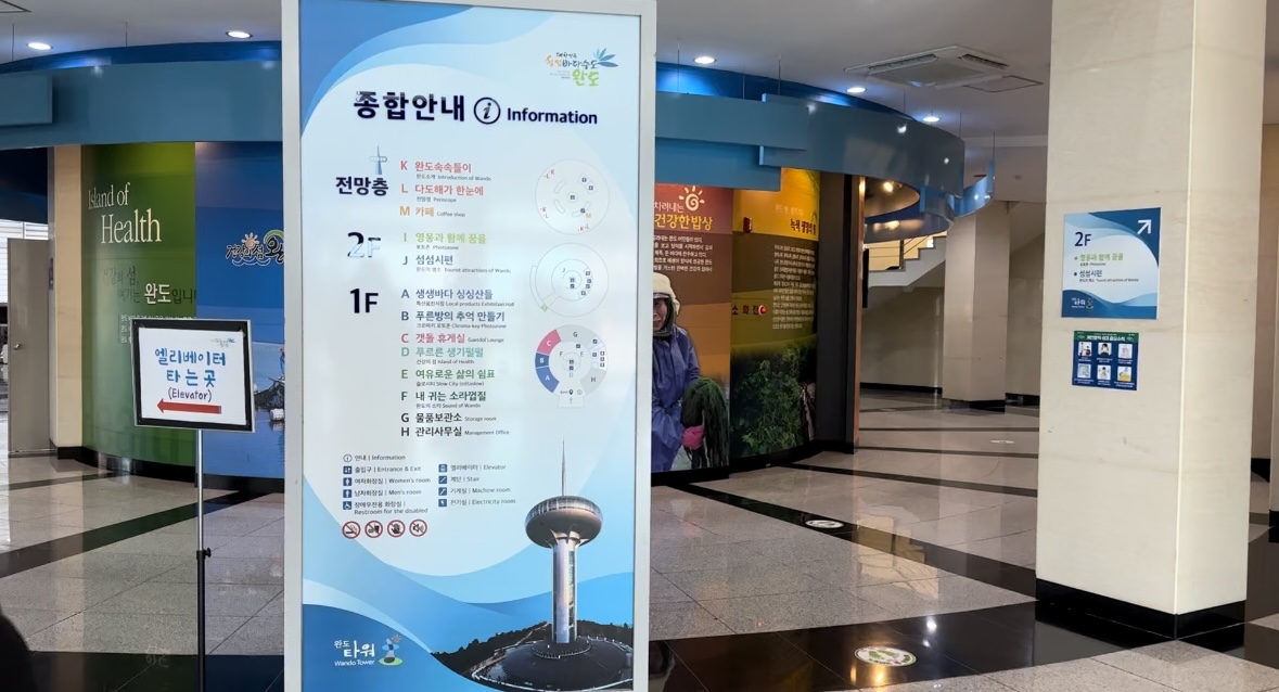 모노레일에 내리면 호떡 파는 곳과 여러가지 구경거리가 보이고 위쪽에 완도타워가 있다.