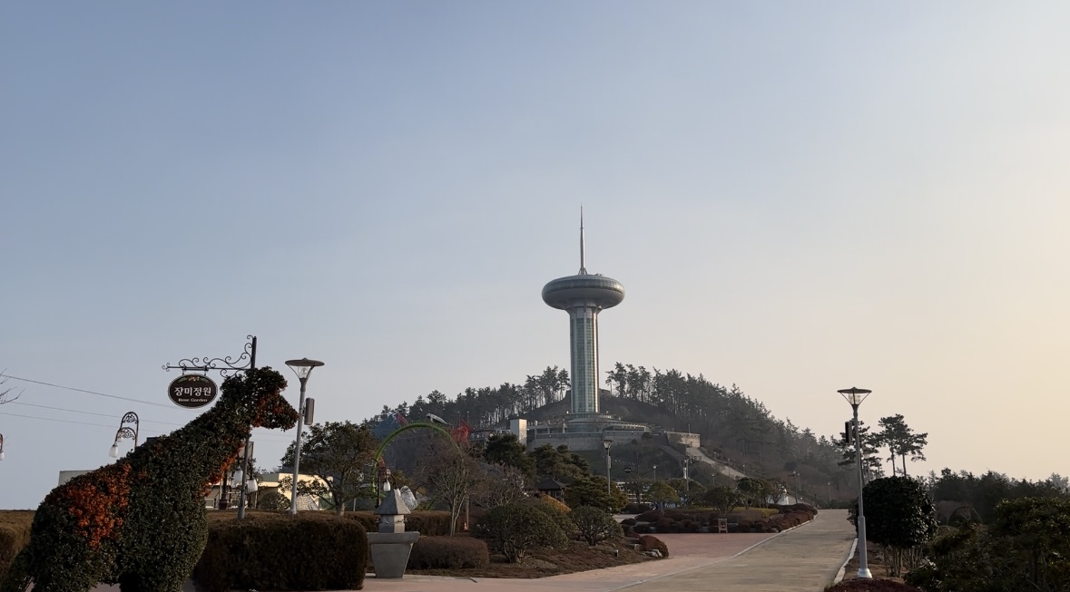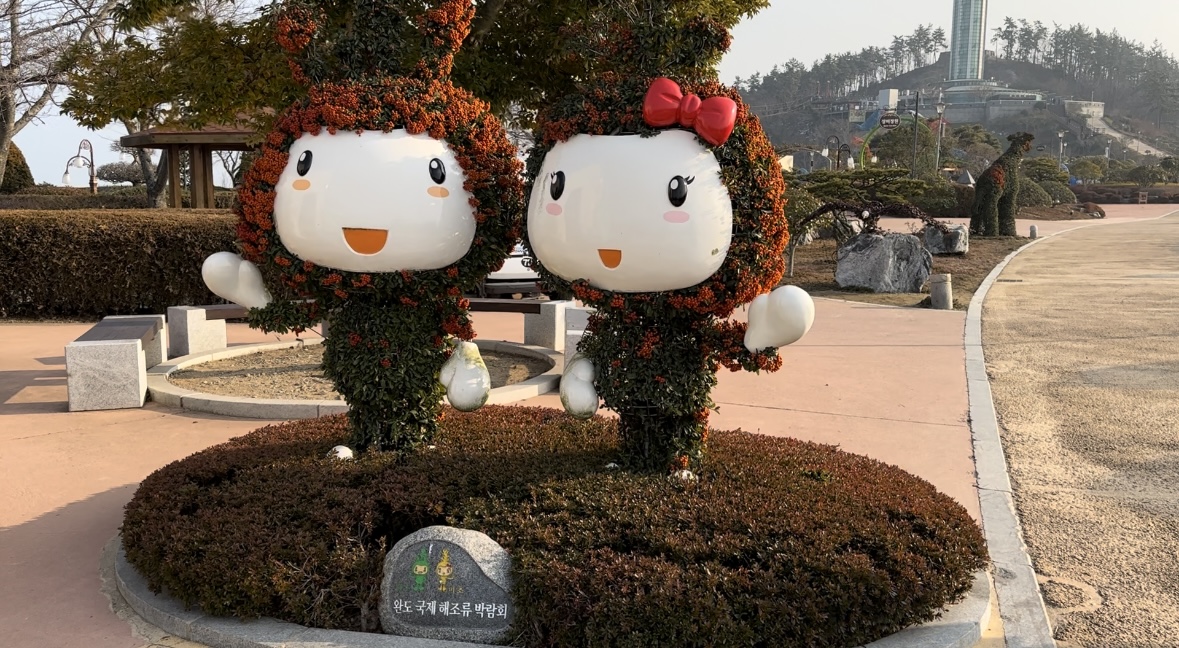 모노레일에 내리면 호떡 파는 곳과 여러가지 구경거리가 보이고 위쪽에 완도타워가 있다.