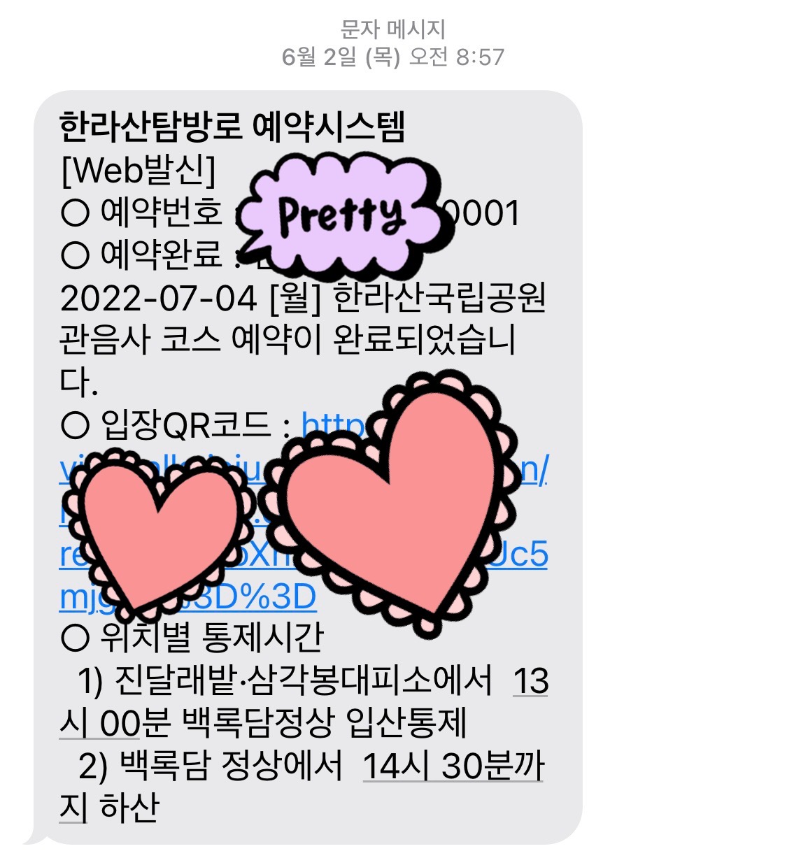 예약을 하면 이렇게 문자가 온다.